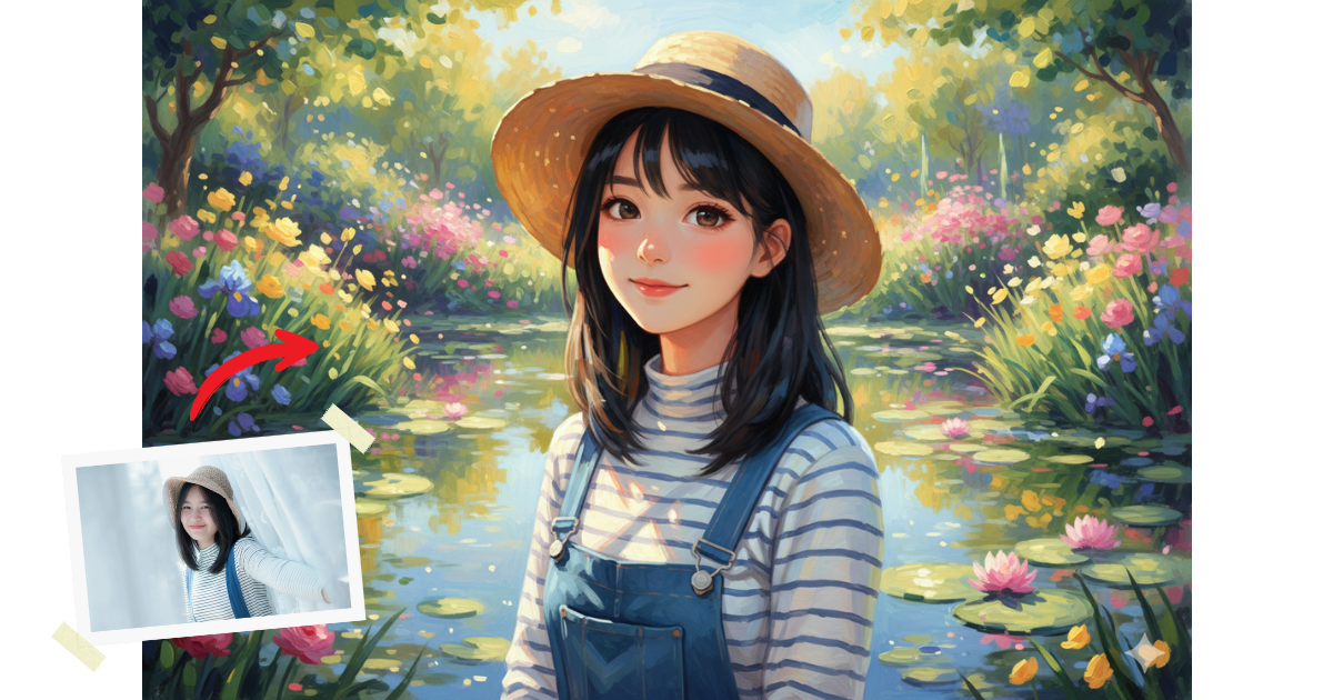 Anime impressionist painting style, vibrant colors, natural sunlight, soft brushstrokes, painterly texture, lush flower garden background, warm and dreamy atmosphere, semi-realistic anime illustration, detailed lighting and depth.