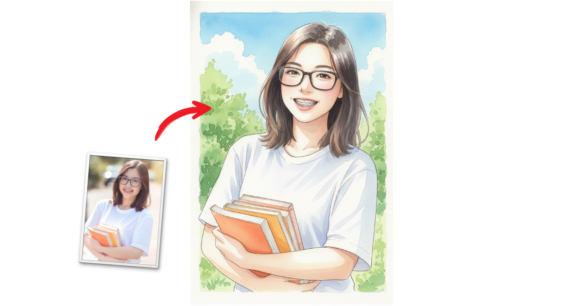 create a Watercolor anime illustration style, soft pastel colors, clean line art, gentle lighting, subtle shading, natural outdoor background with trees and blue sky, calm and cheerful atmosphere, high quality, light watercolor texture, Japanese manga slice-of-life vibe.