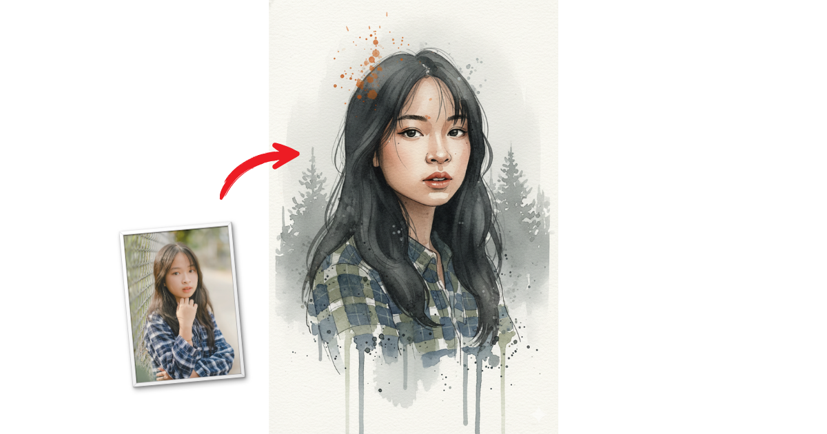 Create a vertical 3:4 digital watercolor-and-ink portrait using my photo as the subject, rendered in illustrative realism with painterly abstraction. Frame a medium close-up (chest up) in a subtle three-quarter turn with a calm but intense, direct gaze; keep crisp linework and highest detail around the eyes, brows, and mouth, while allowing hair strands to stay loose and slightly wind-tossed. Use a cool, desaturated palette of charcoal/Payne's gray and muted olive (for clothing if visible) with warm natural skin tones, then add select burnt-orange splatter accents near the head for contrast. Light the face with soft, overcast diffusion—gentle modeling, no hard shadows—so edges of the jacket can bleed into wet-on-wet washes, drips, and ink spatters toward the bottom. For the background, paint misty conifer silhouettes in layered grayscale fading into fog and paper texture. Emphasize watercolor artifacts—paper grain, blooms, edge bleeds, dry-brush touches—and avoid glossy or photographic rendering; keep the center facial features sharply defined while outer contours become abstract to preserve the moody, cinematic atmosphere.